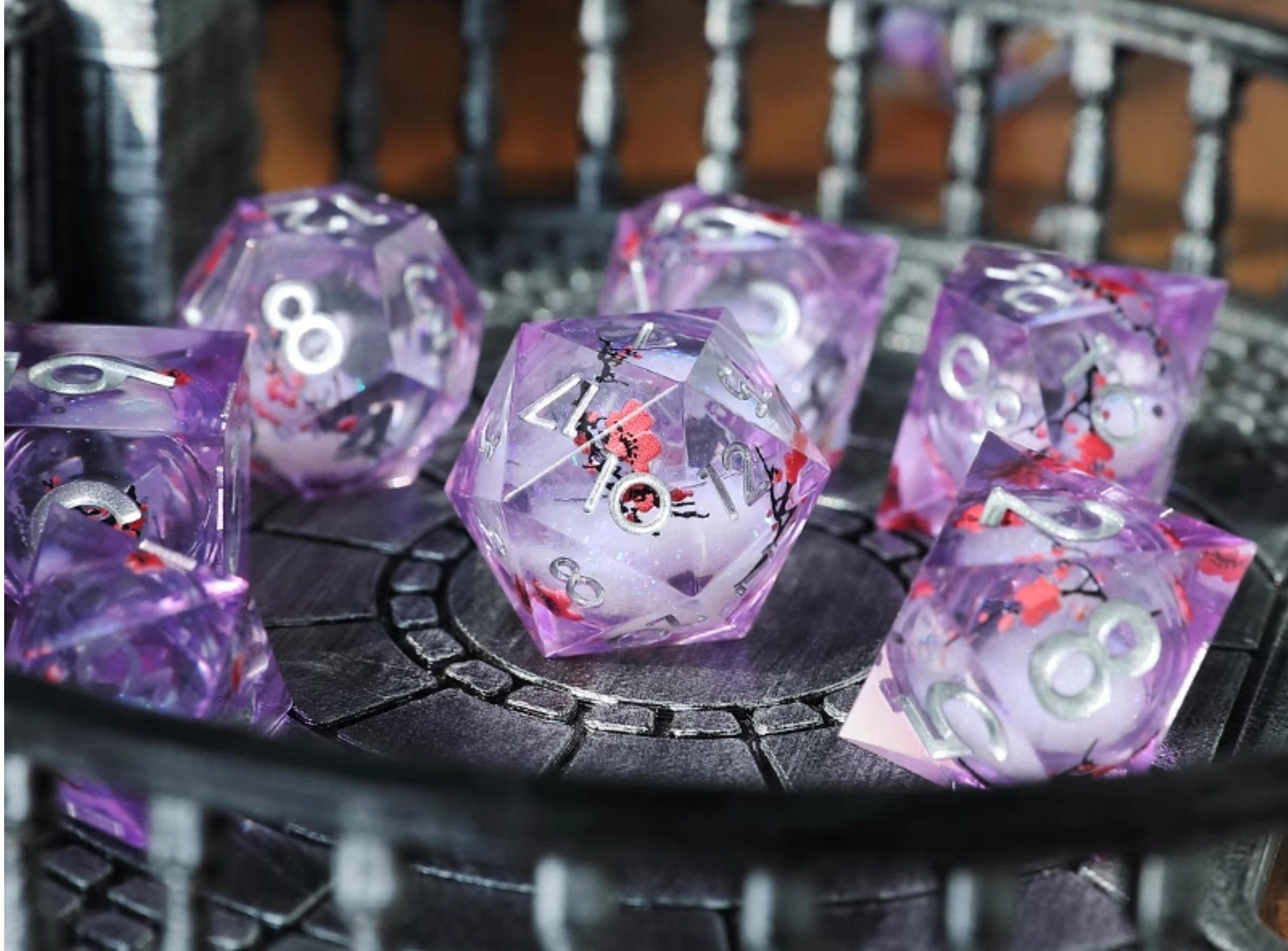 The sharp silver numerals contrast elegantly with the purple body, ensuring clear readability during crucial moments. Perfect for characters like Eastern warriors, quiet spellcasters, or anyone embarking on a poetic journey, this set is an exquisite gift that will infuse your TTRPG sessions with a unique sense of Japanese romance and mystique.